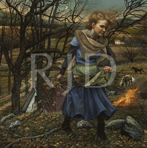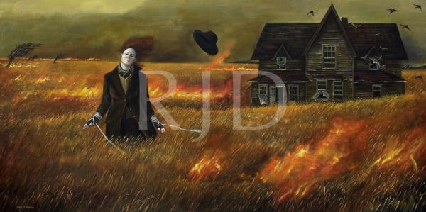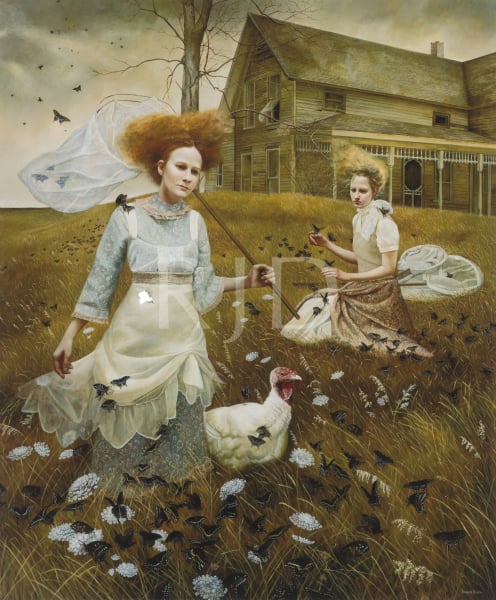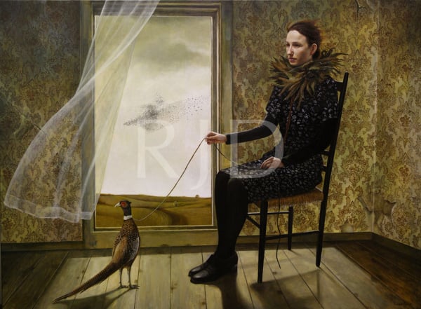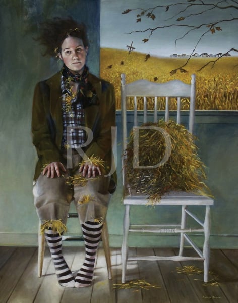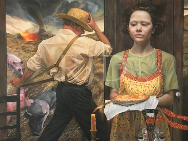 In juxtaposing the human form with animals and a bygone uninhibited American landscape, I provide glimpses into “rooms,” those often times chaotic places we possess internally. The rural, Mid-western landscape of my home state serves as backdrop for the stage of human emotions. The animals present are vehicles for expressing the feelings and underlying tensions suppressed behind the human mask. Symbolic explorations of the soul and events concerning our environment are expressed through the combination of these elements to transform personal ideas into universal metaphors.”