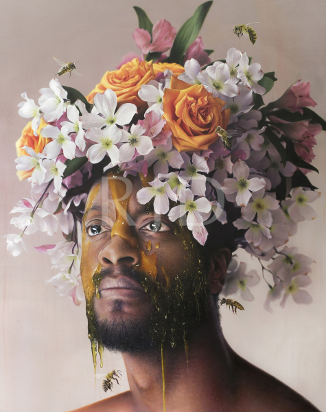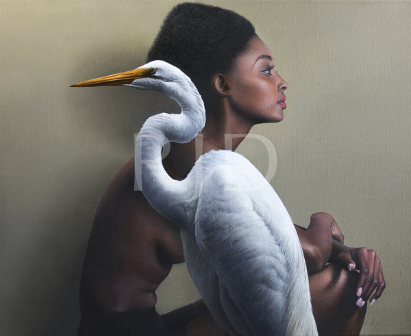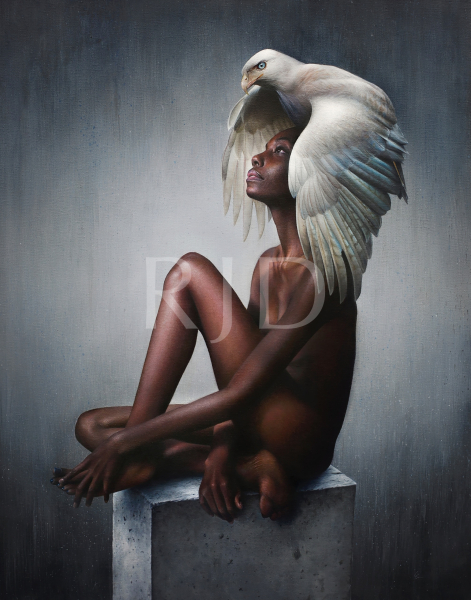 Grant’s work often features figures in direct communication with the viewer. Their meticulously rendered faces gaze out in arresting intensity. When combined with the symbolism, or “clues” (as the artist calls them) found within each piece, viewers discover greater narratives hidden within the paintings.